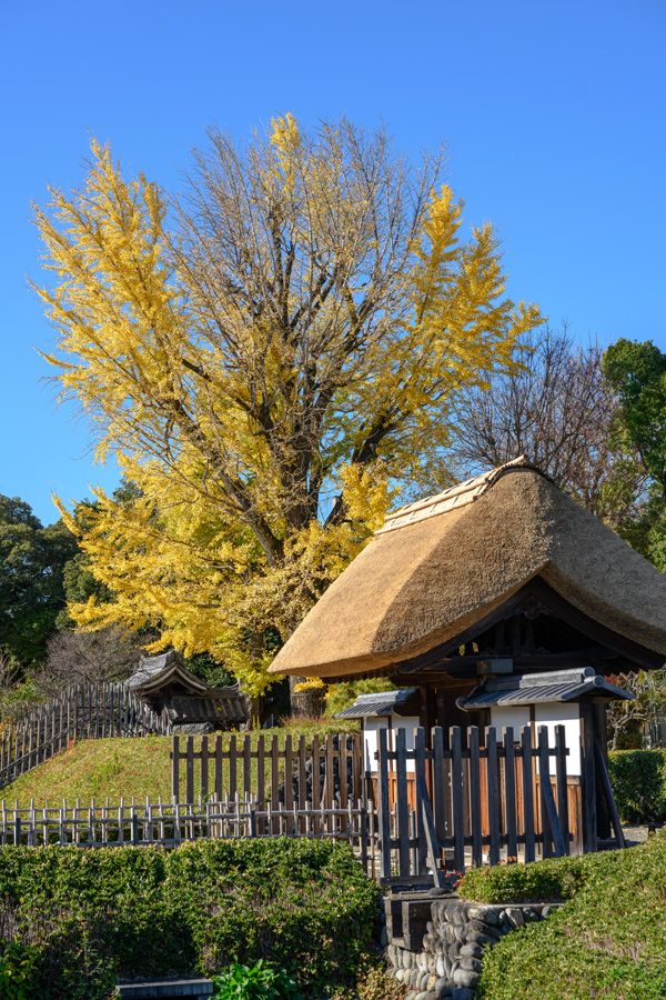 右奥が大イチョウ。広場のイチョウは落葉が進んでいる。