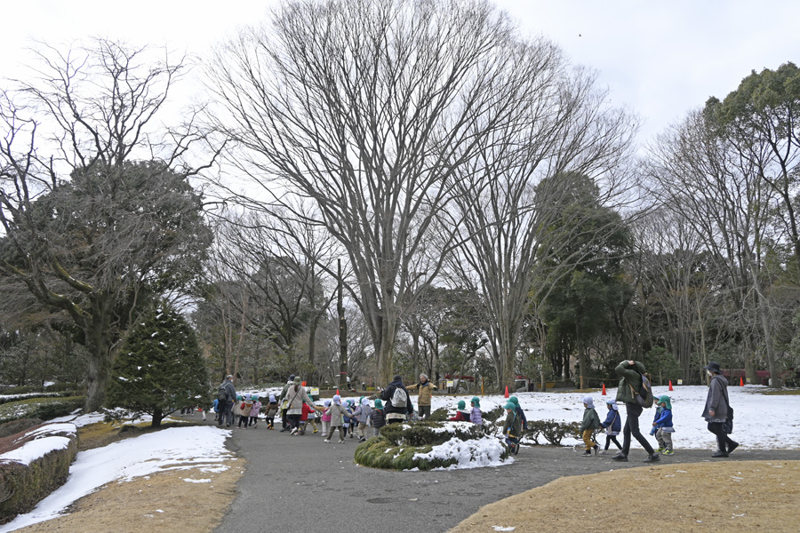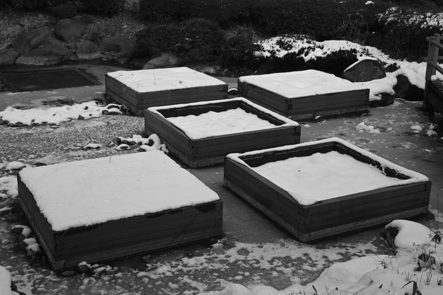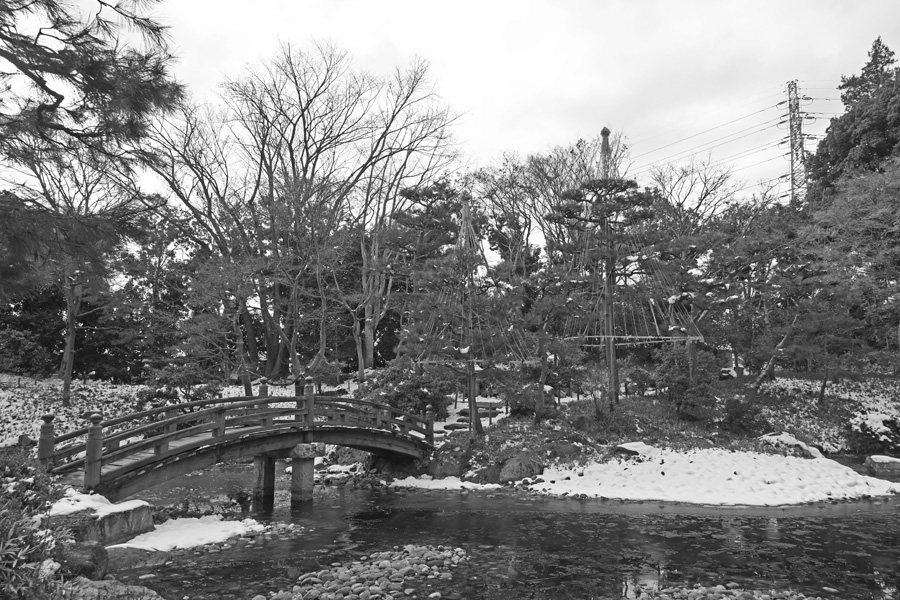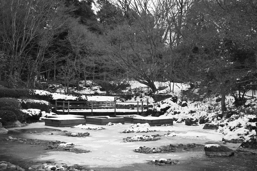 日本庭園は雪で雰囲気が変わっていた。モノクロ変換する。