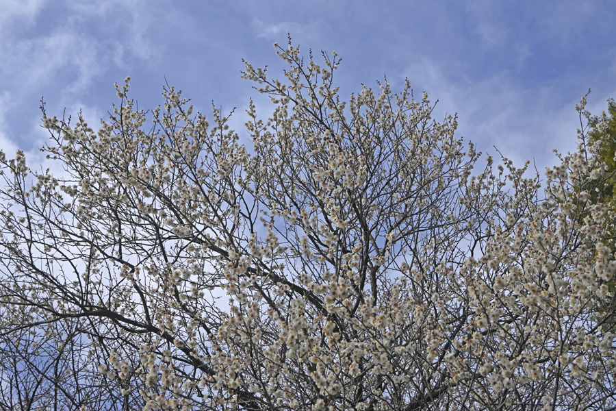 こちらは白梅だ。公園の隣の家の庭から園内の通路に飛び出している。