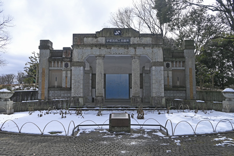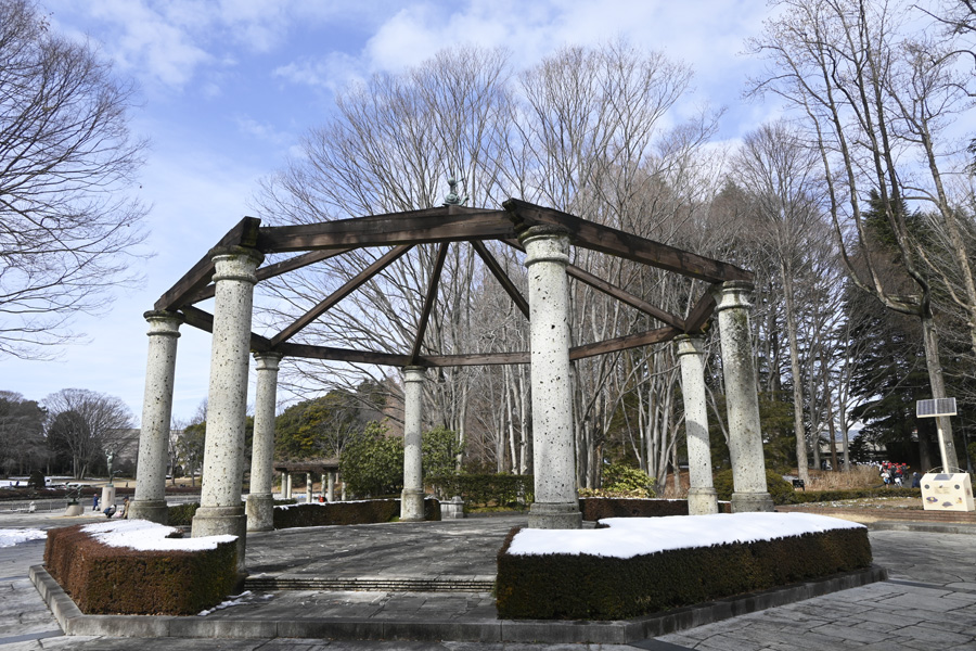 八角パーゴラが青空に映える。大谷石の柱が実にいい。