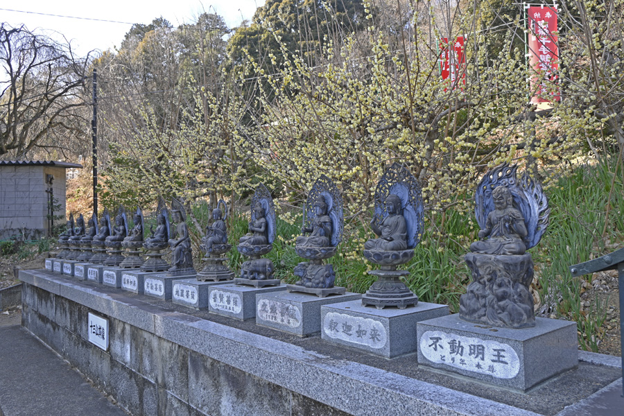 十三仏と十二支お守り本尊。奥には蝋梅が咲いている。