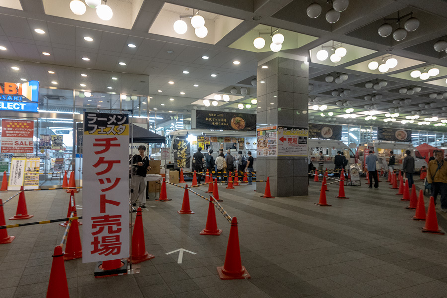 東口ヤマダデンキの前に多数のキッチンカーが並んでいる。