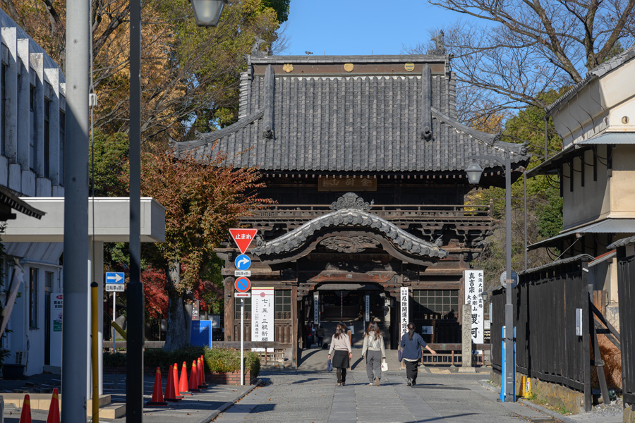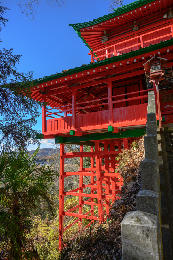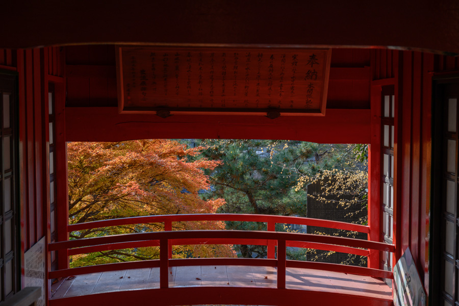 磯山弁財天だ。朱塗りの門とモミジが良く似合う。