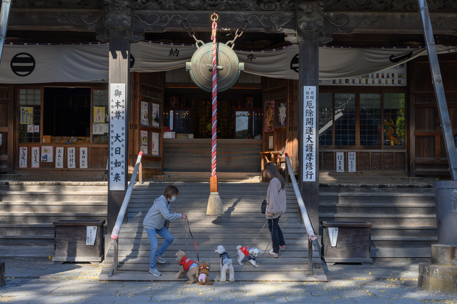 犬を連れて本堂にお参りだ。犬はどうも嫌がっているようだ。