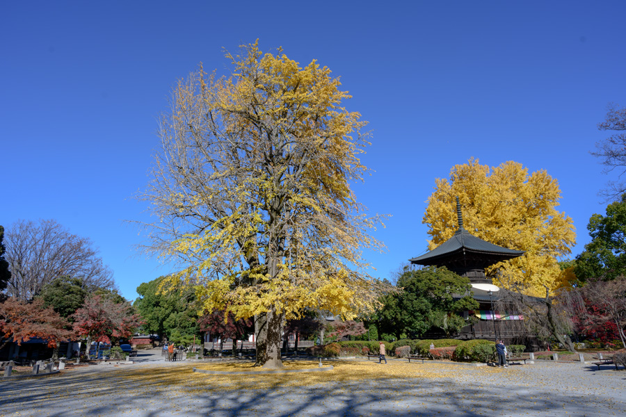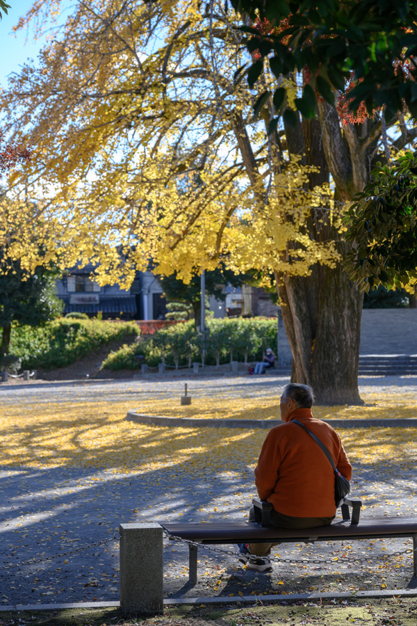 右奥が大イチョウ。広場のイチョウは落葉が進んでいる。